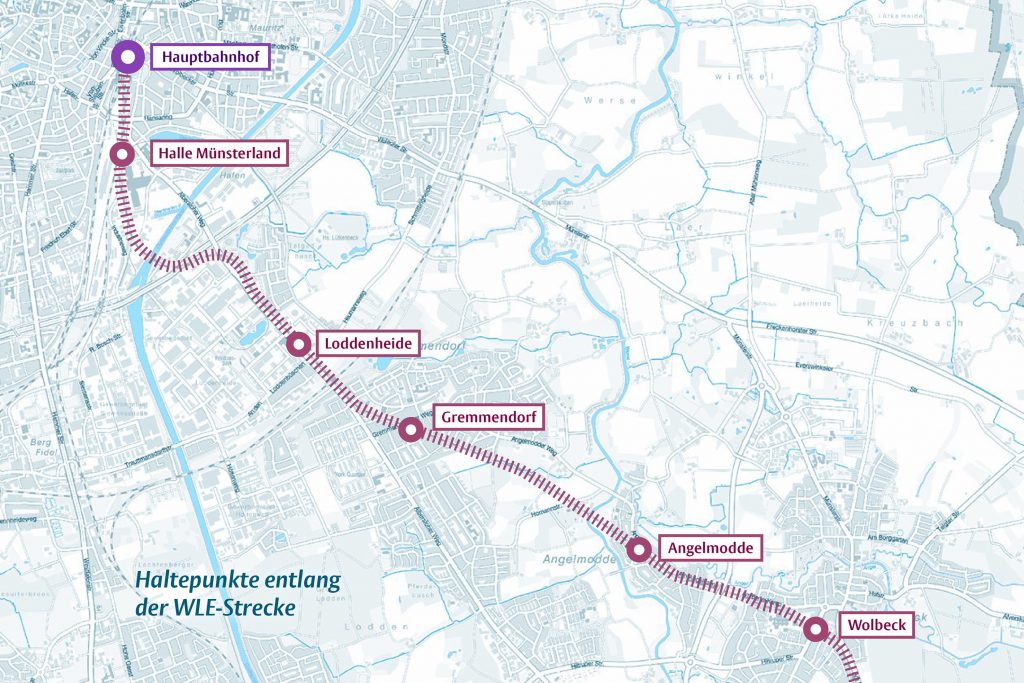 Vom Hauptbahnhof aus sollen die Züge künftig an fünf Stationen auf dem Stadtgebiet – Halle Münsterland, Loddenheide, Gremmendorf, Angelmodde und Wolbeck – Halt machen, über Albersloh geht die Fahrt dann weiter nach Sendenhorst. Für jeden der fünf Haltepunkte in Münster hat die Stadt eine Mobilstation geplant, die insbesondere den Umstieg zwischen Bahn und Fahrrad erleichtern soll.